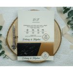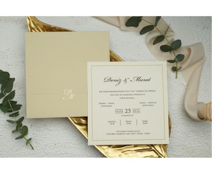 9251 Krem Zarf üzerine gelin damat isim harflerinin yaldız olarak uygulandığı iç parça kartı aynı şekilde krem olan sade şık bir davetiye